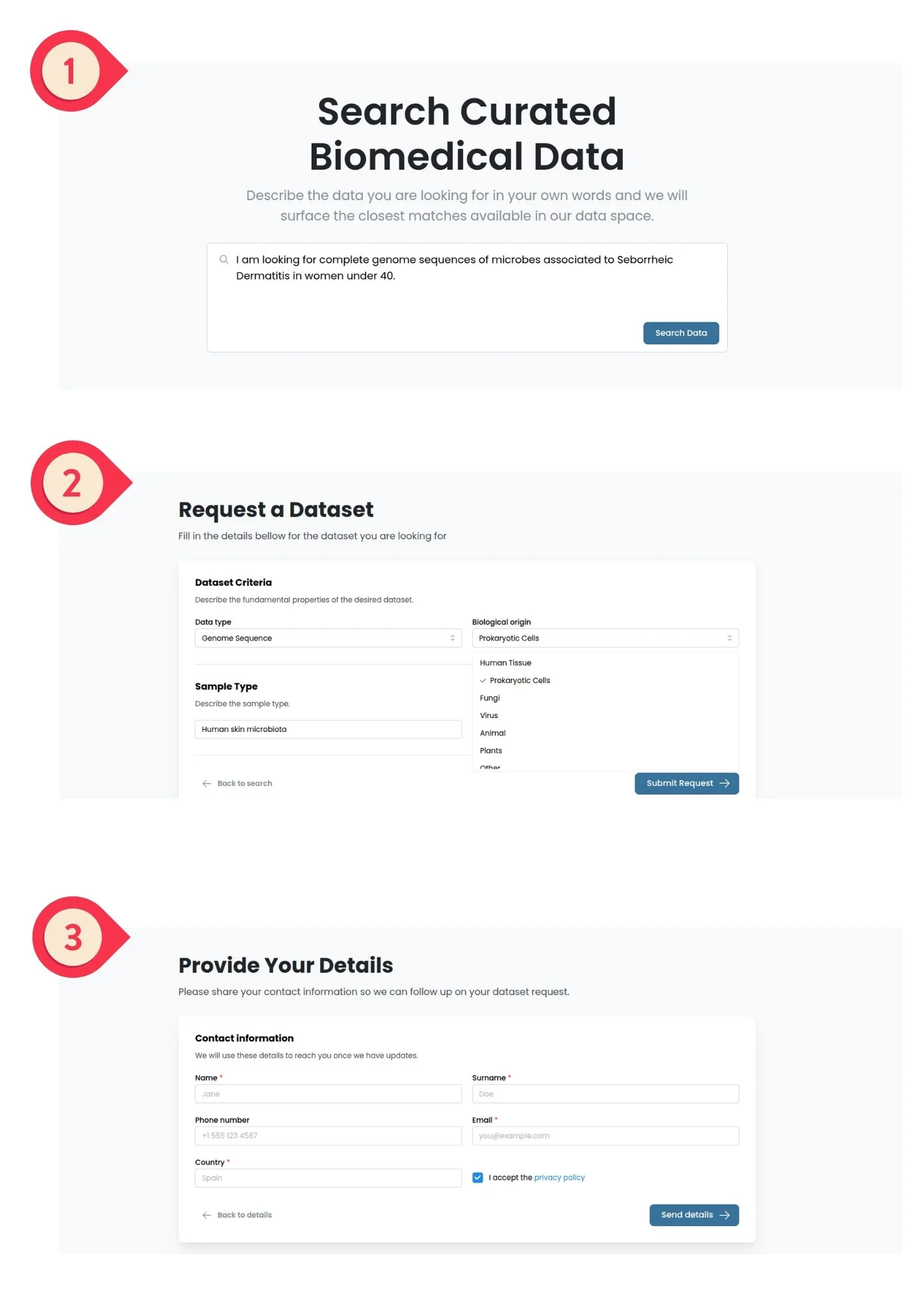 Our system intelligently classifies your request into three key areas: data type, biological origin, and sample type. You have full control: review the classification and make any adjustments needed, or start a fresh search. Finally, provide your contact information so our team can offer personalized assistance.